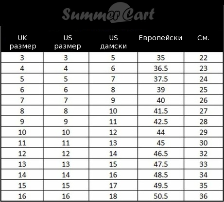 Таблица с размери на обувки